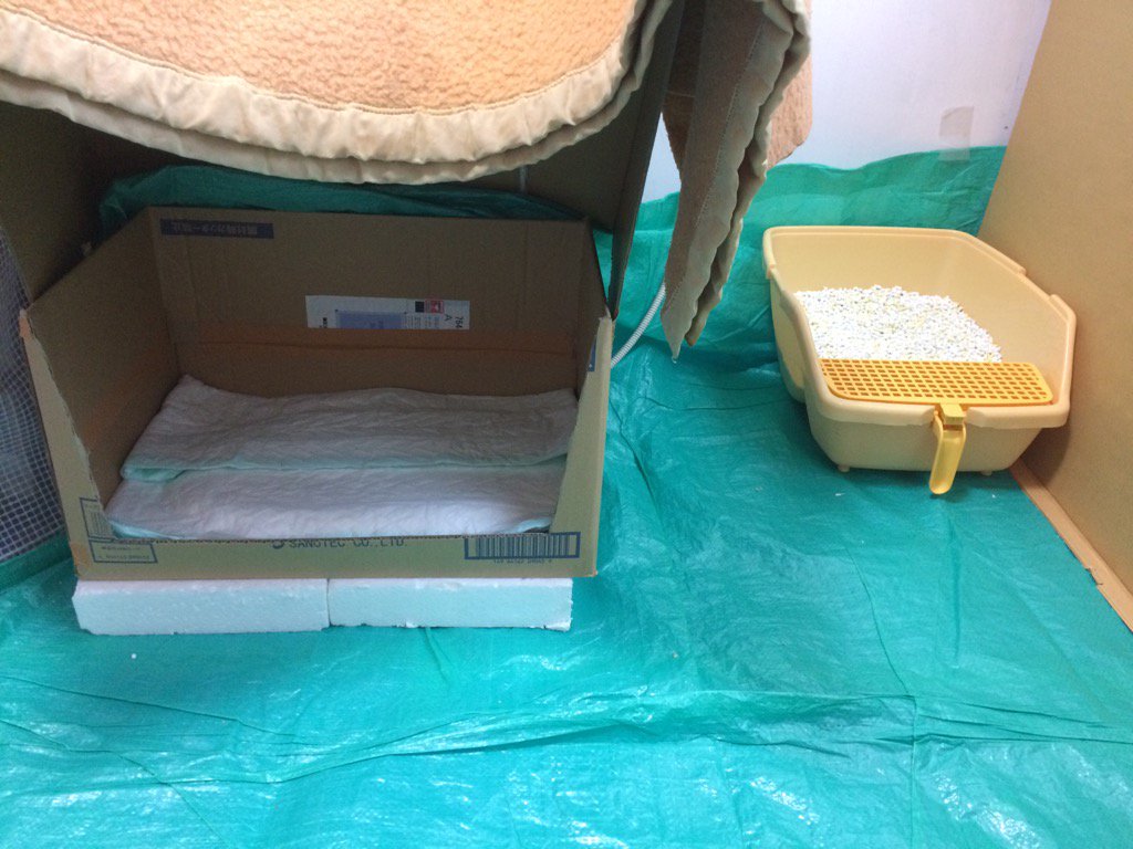 フクちゃんが退院するとき、ダンボール箱の寝床を用意しました。